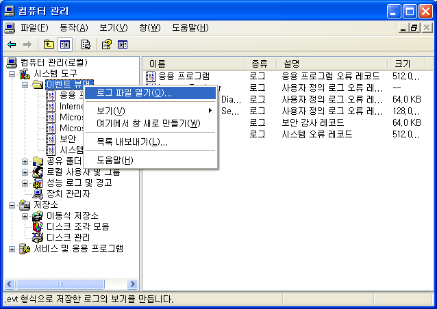 | 응용프로그램 로그 | 응용 프로그램 로그에는 응용 프로그램이나 프로그램에서 기록한 이벤트가 포함됩니다. 예를 들어 데이터베이스 프로그램에서 응용 프로그램 로그에 파일 오류를 기록할 수 있습니다. 로그할 이벤트는 응용 프로그램 개발자가 결정합니다. |