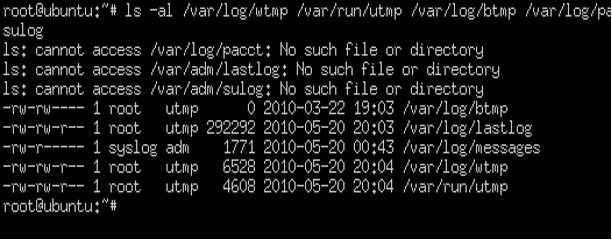 | # last -100 -f /var/log/wtmp root pts/0 192.168.9.15 Wed Apr 28 00:58 still logged in root pts/1 192.168.9.15 Sun Apr 25 21:32 – 20:41 (1+23:08) root pts/0 192.168.9.15 Thu Apr 22 18:09 – 23:26 (3+05:17) root pts/0 192.168.9.15 Sun Apr 18 17:52 – 18:28 (00:35) root pts/0 192.168.9.15 Sun Apr 18 17:46 – 17:50 (00:03) root pts/1 song.local Thu Apr 8 20:52 – 22:17 (01:24) root pts/0 song.local Thu Apr 8 18:18 – 22:17 (03:58) wtmp begins Thu Apr 8 18:17:43 2010 |